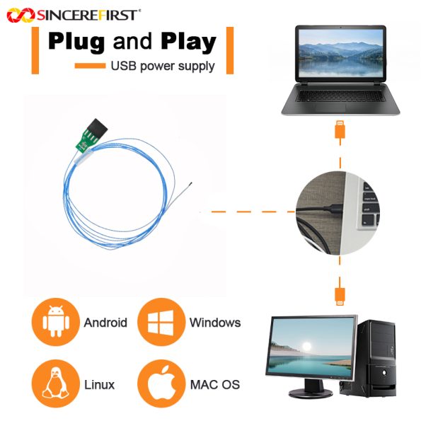 The module adopts a unique separated design, separating the lens and DSP board independently. The lens has a diameter of only 0.9mm, allowing easy access to narrow spaces for observation. It is equipped with 4Pin pins and matched with a DSP board supporting USB2.0 speed. The DSP board uses a convenient Type-C interface and supports the UVC protocol, enabling quick connection to devices without the need for additional driver installation.